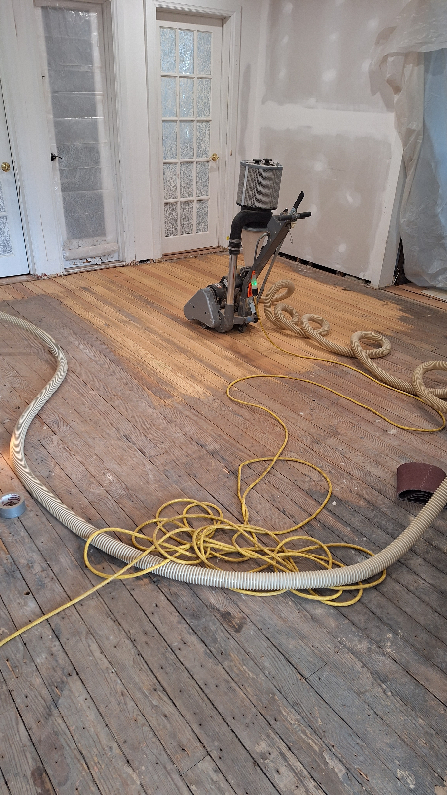 We were called back to an old house that we previously did the floors to the front half of the house. Now the kitchen floor needed redone. The homeowners tore out the existing 5 layers of flooring that was about 2 inches thick . We had to replace some of the old antique heart pine boards.